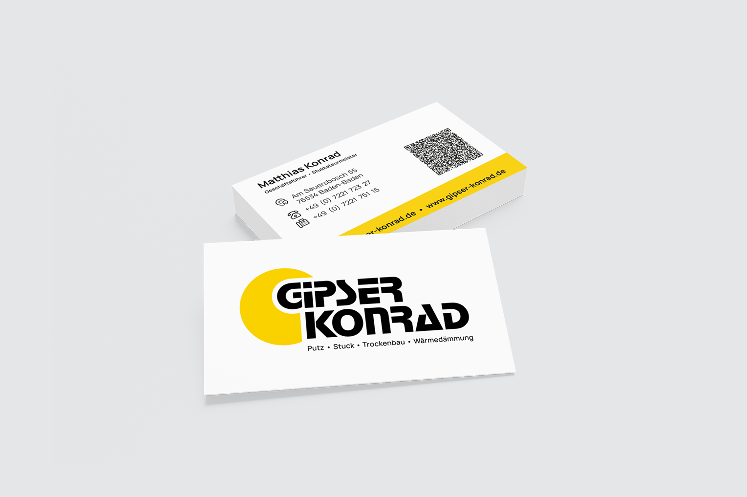 Passend zum neuen Logo entstanden Briefpapier und Visitenkarten, die den modernen Markenauftritt im täglichen Arbeitsumfeld weiterführen. So präsentiert sich Gipser Konrad sowohl offline als auch digital einheitlich und professionell.